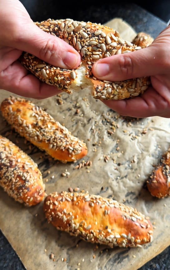 Diesen in 8 Stücke teilen, zu Stangen formen, mit Wasser besprühen und in verschiedenen Saaten wälzen.