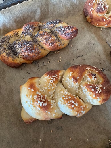 Bagels mit Wasser bepinseln. Nach Belieben mit Sesam und Mohn bestreuen.
